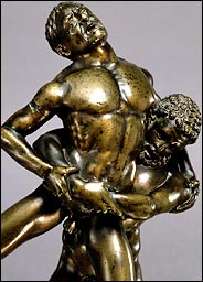 The next three statuettes were all made during the 16th century. Interestingly, in all three cases, Antaeus is held at a much higher position than in Pollaiuolo’s work. Usually, Hercules lifts Antaeus up so that the giant’s buttocks are near or touching the hero’s genitals, but in these works, Antaeus is lifted so high that the violence, which can be sensed more through horizontal body movement is much more restrained.