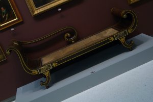 The other feature on the furniture from Picnic is gilt and “gilt bronze” as it is referred to in literature at the Carnegie. However, Wendy Cooper in her book “Classical Taste in America” refers to the chair refers to Egyptian ornaments as “cast brass.” I learned recently that what is called “gilt bronze” is usually brass, in chandeliers anyway, so that may be the case here. Inspection of the chaise lounge at Carnegie does appear to have gilt. There were a number of foundaries in Pittsburgh early on, as well as silversmiths and other craftsmen who might have been able to produce these ornaments on demand. They could also have easily been imported from Boston or England.