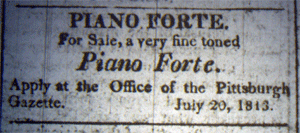 Have you ever imagined what it would be like to travel with a piano across the Alleghenies before the days of trucks, railroads, or even canals? Yet an ad appearing in the Post-Gazette of July 20, 1813, suggests someone did just that.