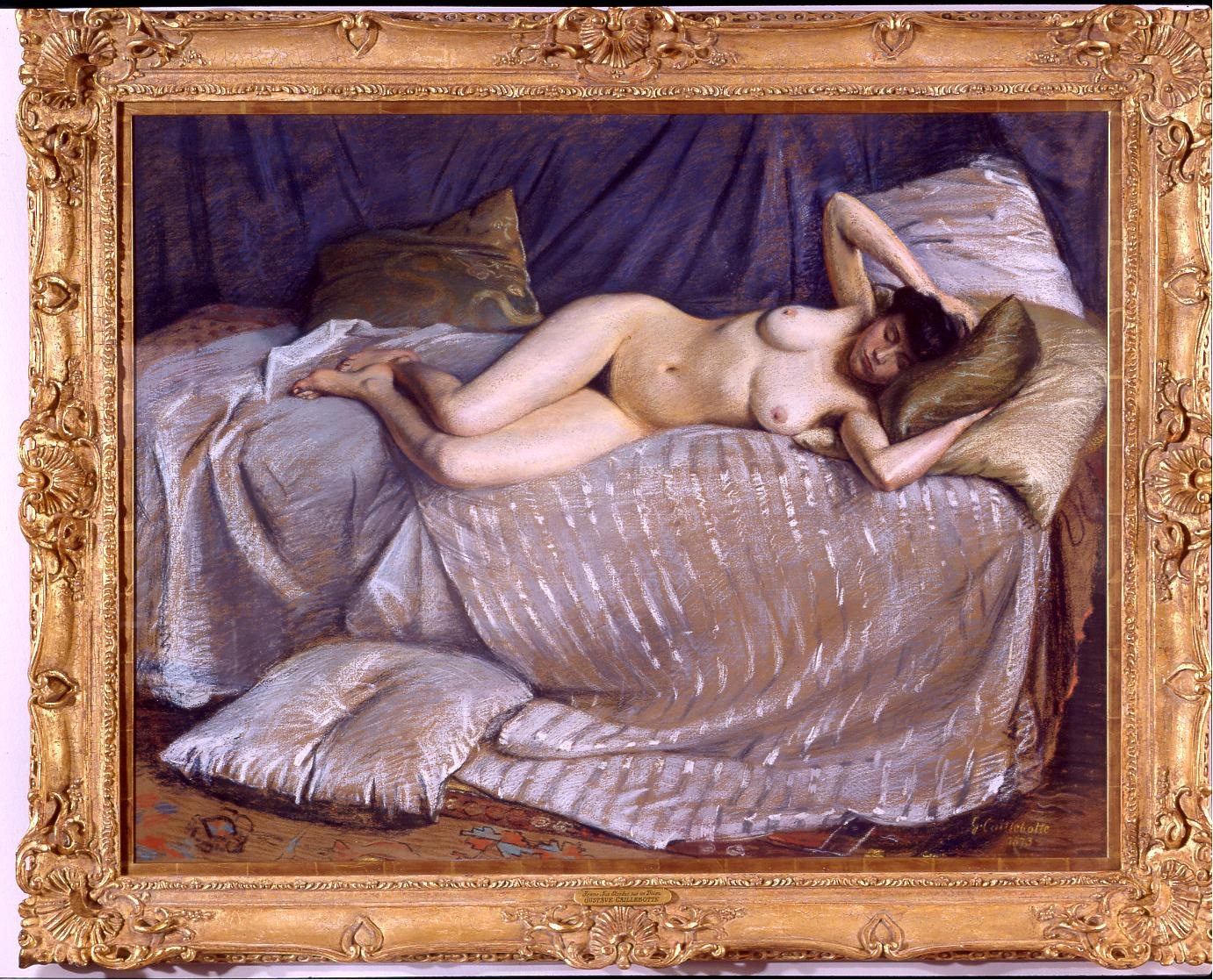 Femme nue étendue sur un divan is believed to be the earliest dated work by Caillebotte and differs from much of his later work. “The suaveness of the treatment of flesh and cloth here, and especially the artist’s attraction to the satiny sheet of the striped drape, remind us that at the outset of his career – in instances such as the wet-and-dry wood floor and curled shavings in Raboteurs de parquet – Caillebotte was attracted not only to linear structure but simultaneously to the subtle discrimination of shifting plays of interior light on surfaces. With the adoption of a more boldly brushed technique inspired by the work of Manet, Monet, and Renoir, he eventually sacrificed something of this latter aspect, and not without loss for the personal character of his work,” wrote Kirk Varnedoe, the late art historian and noted curator of painting and sculpture at the Museum of Modern Art in New York, and the first Cantor Fellow at Stanford University.