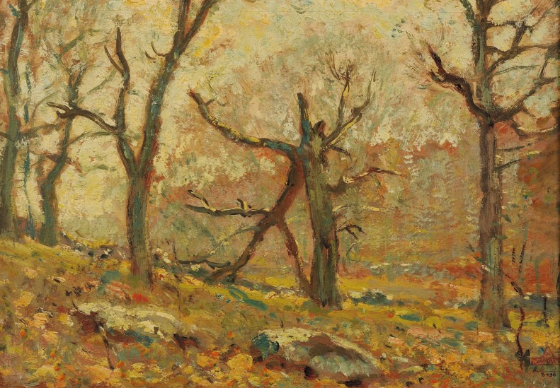 The popularity of Hague School’s grayness did not extend to American artists of slightly later period in the auction. A study by Henry Ward Ranger, bearing the estate stamp, was sold near $2500, higher than its high estimation yet still within an expected range. In a few examples of Ranger’s landscape studies which I have seen, the chalk-like light impasto is more evident because of the lack of the jewelry-like final layer’s varnish that the artist thought indispensable. The study provides an advantage to closely look at Ranger’s technique: the brushstrokes balanced between abandoness and calculation and the warm over the cool for the color pallet. The barren woodland, possibly from Connecticut, bear the charm and tenet that was infused in the school of Lyme artists: an affinity to natural soils that were once eroded and disappearing. In the book “Charles Warren Eaton and the Tonalist Movement” by David Cleveland, the author pointed out the nostalgia run-down farmlands, like the tonalism movement itself, are more transient than eternal. Thus, what Ranger painted was a snapshot of humane landscape before it went back to the wild.
