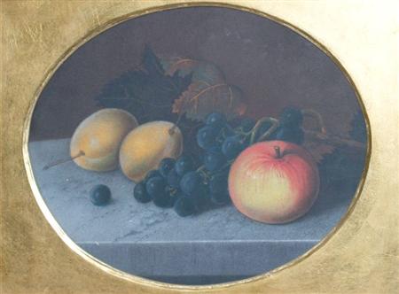 One nice painting came upon Doyle Auction on Wed, July 15. During the preview, Geo and I spotted the painting in a meticulous gilded frame. It is in the style of Raphaelle Peale from its tightly grouped objects arrangement. This superb rendered fruit still life, to my surprise, is a pastel painting. The bright peaches and the apple are separated by dark grapes so that the main focus point — the striking red and yellow on the apple’s skin is echoed by the secondary focus point of the less glossy peaches. One large grape leave, apparently withering from lack of water, sprawls over the two peaches as if the freshness could be gone momentarily. (The coloration of the peaches turned somewhat gray at the highlight, which I was not sure was caused by fading or artistic choice.)