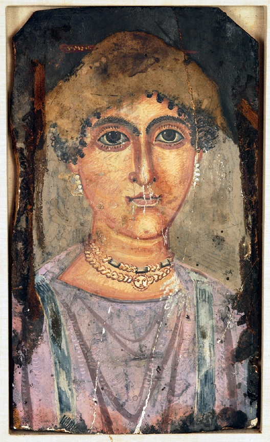 I am not sure how the sarcophagus is related to the portrait. Roman Period mummy portraits were painted on wooden panels that were slipped into the mummy wrappings over the face of the deceased. Often the artists used melted wax as a medium, building up thick layers of pigment and highlighting the facial features with touches of white. Although painted in the naturalistic tradition of the Greco-Roman world, these images are idealized representations of the deceased, and they were used in a traditional Egyptian funerary context.