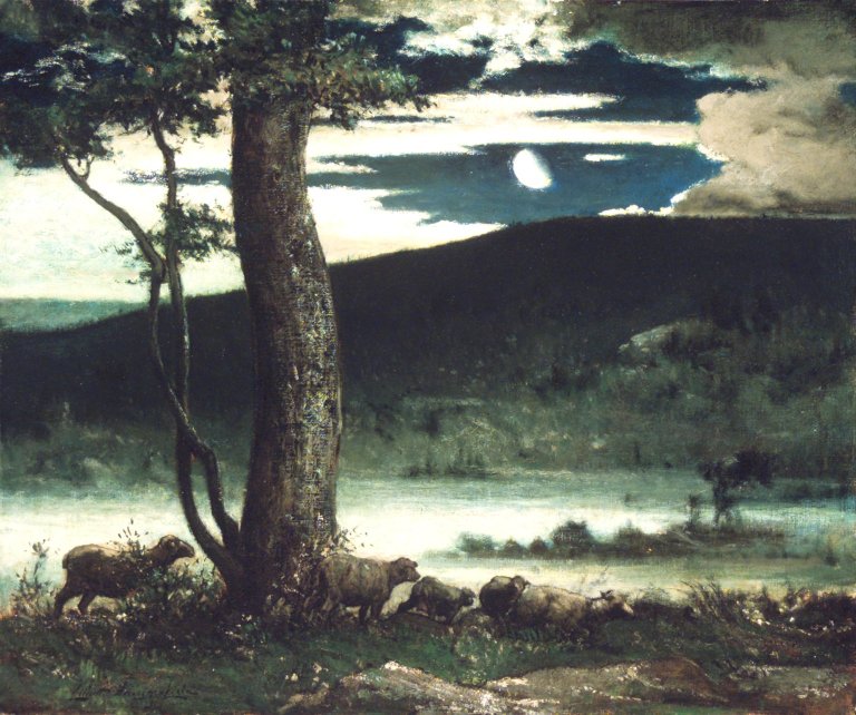 “Midnight Moon” was probably painted in 1906, one year after Daingerfield finished the mural for the chapel at St. Mary the Virgin in New York City. The Last quarter moon surrounded by clouds recalls the mystic atmosphere in those of Ralph Blakelock. The marsh land shrouded within mist and haze and the prominent somewhat eerie-looking tree has the same dream-like quality in those of Ryder. If Blakelock eternalized the silent beauty of moon behind trees while Ryder froze the actions to give a mystified storytelling, Daingerfield’s “Midnight Moon” lied in between: it was neither muted nor vigorous. The group of sheep glazing along the river bank perhaps pertains an additional layer of religious meaning as Jesus said “I am the good shepherd; and I know mine own, and mine own know me …. and I lay down my life for the sheep.“