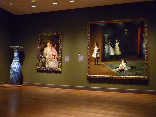 With two rooms and one hallway available for the vast collection of its American art, MFA, Boston cleverly features two artists – Copley and Sargent instead of a motley collection of everything. Except the dramatic painting of Watson and the Shark, the rest of John Singleton Copley’s paintings are portraiture. With a wall filled with faces of most prominent figures in Colonial period such as Paul Revere, Samual Adams or John Quincy Adams, the patriotism undertone is obvious. But Geo commented that Copley, influenced by family members who were all loyalists, left America before the revolution and never returned. The Liberty Bowl made by Paul Revere is displayed not far from Revere’s portrait. A piece of silverware that symbolizes the birth of a nation and the start of Revolutionary War, it is also beautiful and well crafted. Yet would it be the same if the bowl were made by John Doe? Will its artistic virtue claim a firm spot in the galleries? I don’t know because there is no way for me to view the punch bowl without being influenced by its nationalized status. The tangible value of a famous piece of art lies not only in its own beauty, but also in all provenance and research with extra layers of historical significance and technological insights.