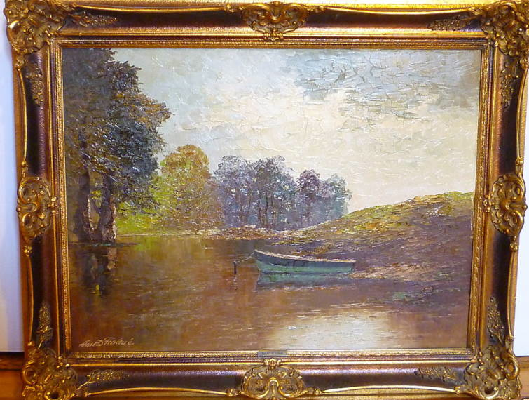 If Alpine’s towering ridges and summarily grandeur make the use of palette knife technique a natural artistic instinct, Grabone’s landscape of a pond and boat shows his deft skills freed him from subject limitation and he could paint any scenes that spoke to him.
