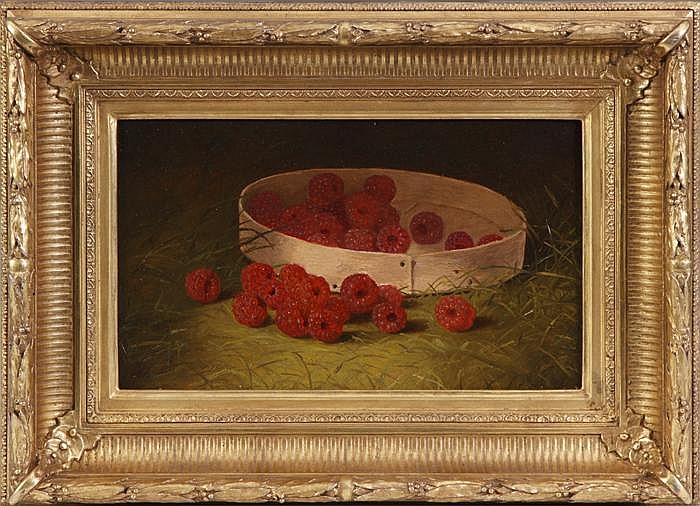 Brown, competing with George Hall in New York area in the same period, was more influenced by the pre-Raphaelite style. His fruits are equally detailed, if not more, than those by Levi Well Prentice, but he can invented a harmonious world of still life setting itself (either indoor or outdoor), similar to a landscape that he was equally famous for. In this particular painting, the lush painted raspberries are being picked, highlighted by dramatic light. The grass recedes into the dark, which gives this small setting enough depth and space to imitate nature. More interestingly, Brown chose not to light the main objects but to put raspberries and the basket at the border of the brightened spot. Together with the slightly tilted surface, he created an illusion of transient beauty and momentary dynamics as if the fleeting light would soon pass those fruits and if not being “picked”, they would fall back to nature, forever forgotten.