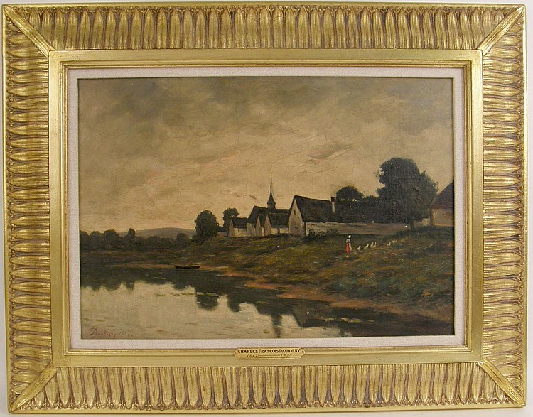 A typical painting by Daubigny from a boating perspective, the painting will be a substantial addition to art collectors of the French Barbizon School or French impressionism since Daubigny championed Impressionism from early on. Unlike Rousseau, Daubigny’s nature is more tamed, cultivated, and almost exclusively horizontal. To some extent, his view of humanized nature is more or less echoed by the American tonalism school which favored cabins and wood stumps although only Dwight William Tryon officially took instruction under him. I would check the catalogue raisonne by Hellebranth published in 1976 to see whether the painting is listed in the book, although no raisonne publication can guarantee complete coverage.