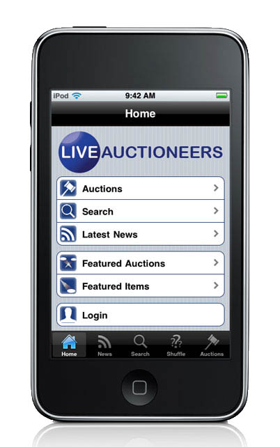 LiveAuctioneers App Technologies, a division of LiveAuctioneers LLC, has launched the world’s first app for real-time bidding through Apple-brand mobile devices. The downloadable app is compatible with both Apple’s iPhone and iPod Touch series, and interfaces with sales conducted by the nearly 900 auction houses worldwide who use LiveAuctioneers.com for their Internet live bidding.