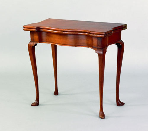 One of the tables (lot 32) was posbbly made in Rhode Island. A Queen Anne mahogany card table made circa 1765 has pointed slipper feet. The cabriole legs, with less curvature spring up tall and elegant. The mahogany wood is first rate and in great condition. Mrs. Gordon probably used this table near the window because the left side of the top surface fades much more than the right. The table is estimated between $5000 to $10000.