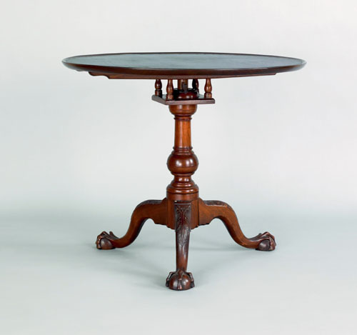 Another table (lot 39), also from Gordon’s estate, looks much more masculine. The Chippendale tilt-top tea table, made of walnut, has a birdcage that enables table top rotation. The suppressed ball feet showcase the excellent craftsmanship: the wide-spread claws are in such great tensions that the balls look in danger of being crushed at any moment. Such designs were common among Philadelphia makers, but the presence of walnut lead to a more general “Pennsylvania” attribution.