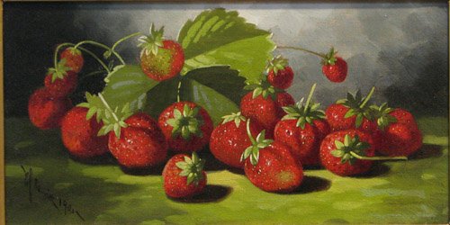 Another Rhodes Island painter, Edward C. Leavitt had also a Fall River lineage. Studied after James Morgan Lewin, a painter of the Fall River school, he went on to become the Rhodes Island’s most successful still life painter of the 19th century. Quite often, Leavitt used a long horizontal format (like lot 139) to accentuate a more decorative oriental aesthetic, with sumptuous colors and an opulent overtone. (In the Brandywine River Museum, one of his best still life paintings displays a variety of objects sprawling under romantic moonlight. ) Dated in 1901, the painting is more introvert than his typical floral paintings: The staged light plays with the lush strawberries and creates a strong pattern of light and shade.