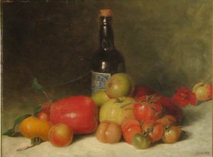 A group of 19th century Rhodes Island painters, all directly or indirectly associated with the Fall River school, are represented with their still life paintings in the sale. George William Whitaker was born in Fall River, Ma, and developed an art community in Rhodes Island. Although the “dean of the Providence painters” was primary known for his landscape paintings in Barbizon tradition, he was also prolific in still life paintings. His sense of colors is vividly shown in lot 208, a fairly large canvas which projects a group of warm-toned fruits and vegetables and a bottle of beer under soft light.