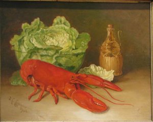 John Clinton Spencer, another Providence painter, studied briefly with Leavitt. Spencer painted both games and fruits paintings under staged light. In particular, lot 193 features a red lobster, which seems to be his specialty. This painting, measured 19 by 23 inches, makes it a fine demonstration of his inside-out anatomical knowledge in the specie. Yet I am wondering whether one would appreciate the fine quality of the painting without being intimidated by this larger-than-life close-up depiction of the lively monster.