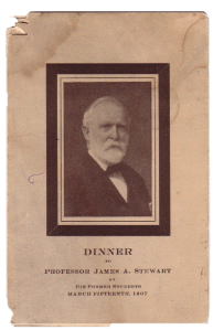 Now you might have noticed that Jimmy Stewart wasn’t on the list of notable visitors. The 1931 demolition wouldn’t make much sense either. Jimmy Stewart the actor would have been just 23 when the hotel met its demise. The title of this post was chosen because while wandering through Antique Depot in nearby Duncansville, PA, I picked up a copy of a program from the hotel titled Dinner to Professor James A. Stewart by his former students dated March 15, 1907.