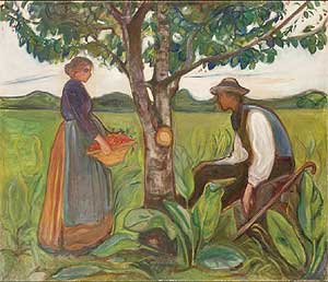 Rendered in verdant greens with rich orange, red, and yellow accents, the painting’s focal point is a lush fruit tree laden with ripe red cherries. A man and woman dressed in rustic work clothes stand facing each other on either side of the tree, creating a tableau reminiscent of Adam and Eve before the Tree of Life. Though the woman’s visible pregnancy and the scene’s lush greenery seem to communicate a theme of regeneration and hope, a fresh wound – as from a newly-cut bough mars the tree trunk between the two figures and lends the scene an ominous, unsettled element.