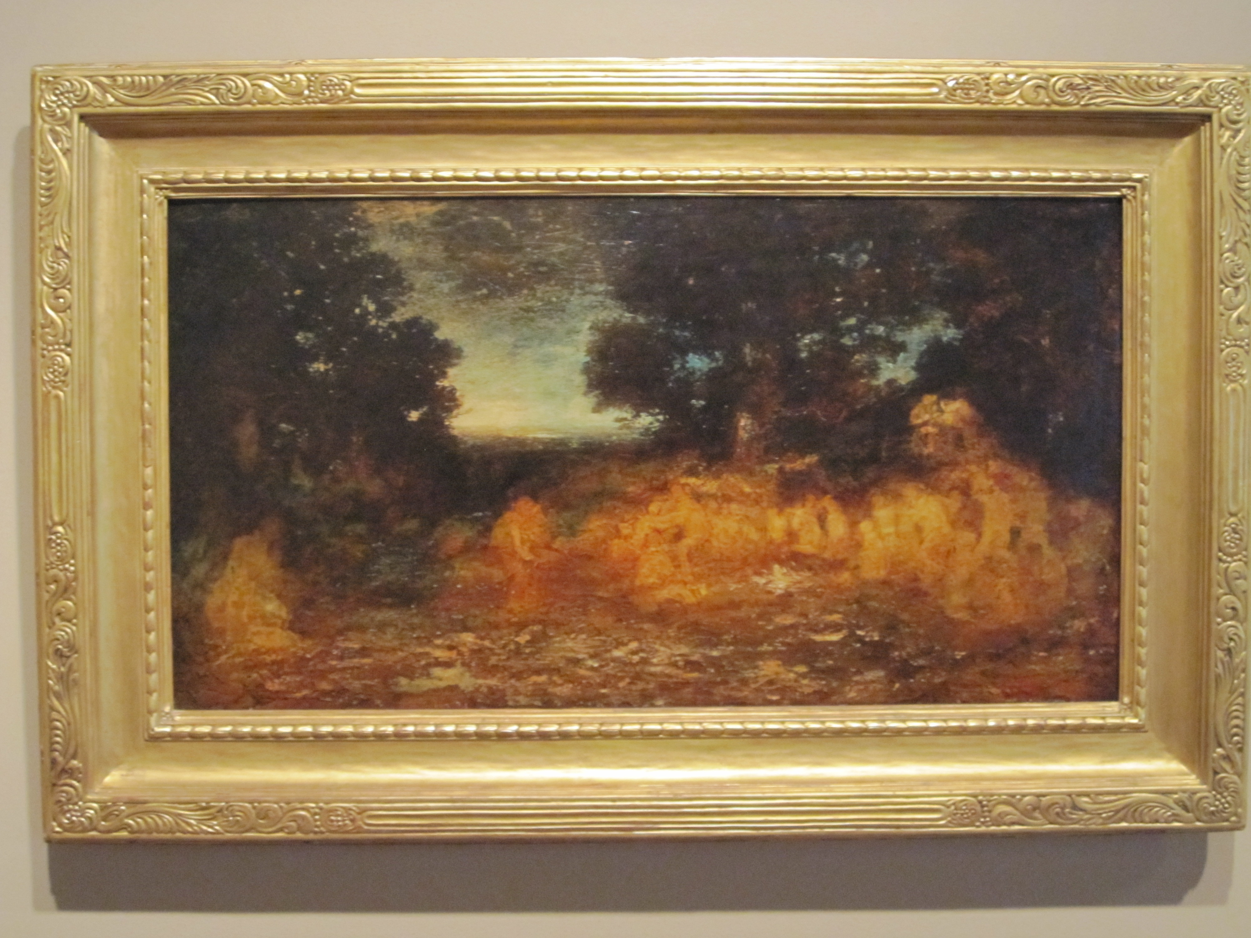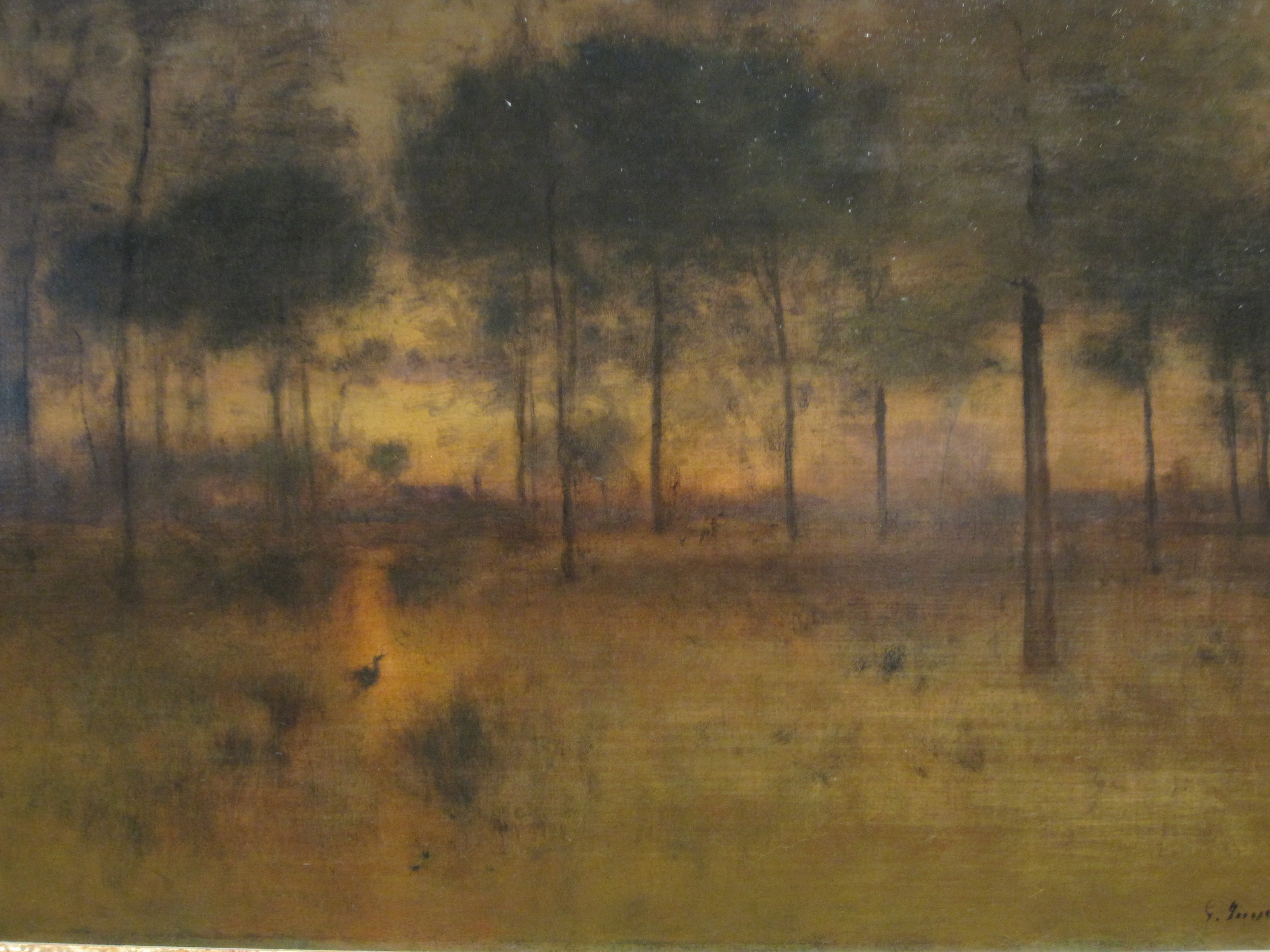 George Inness’s The Home of the Heron also appears at first glance to be an unfinished work. Like the Blakelock, however it is clearly signed. This may not mean as much for Inness as he always reserved the right to make changes to paintings, sometimes making significant revisions even after they were sold. Compare it to Blakelock, however and we find that artists of the period were often exporing the interaction between people and the landscape and sometimes animals and the landscape. Many works by Inness include misty figures. When we look at them we’re not quite sure if they are there or not. To me they represent the humanness that’s imprinted on a place, a humanness which remains after we are gone.