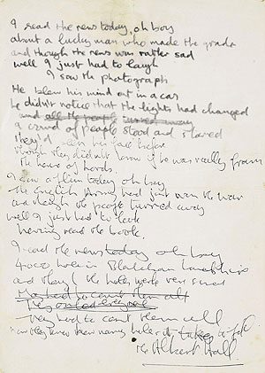 The double-sided sheet of paper in Lennon’s hand is complete with cross-outs, corrections, reworkings, and chronicles the evolution of one of the most famous pop masterpieces from conception to the lyrics presumably used in the recording studio.