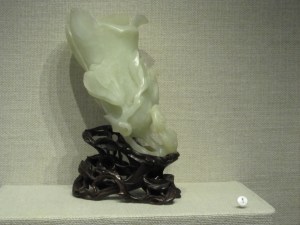 A jade brush-holder on display was marvelously carved with emboss figures and landscape, impossible to be acceptable as necessity of literati in Song or Ming dynasty. The pursuit of luxury to an almost maddening degree in Qing Dynasty is illustrated by a tea pot nearby. Jade tea pot would not survive the sudden temperature change and pouring hot water into it would surely cause cracks, yet it is not likely to be ceremonial as tea pots were not commonly used in ritual activities. The original owner of this tea pot, like that of the brush holder, sought these objects as the unique combination of cultural elements and material opulence.