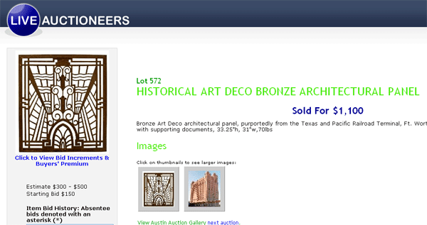 A bronze art-deco panel said to be from the Texas and Pacific railroad station in Fort Worth brought intense bidding between a floor and internet bidder Saturday at Austin Auction Gallery. The floor bidder won out with the panel at $1,100. The item description provided was as follow: Bronze Art Deco architectural panel, purportedly from the Texas and Pacific Railroad Terminal, Ft. Worth, Texas, c. 1930, together with supporting documents, 33.25″h, 31″w,70lbs