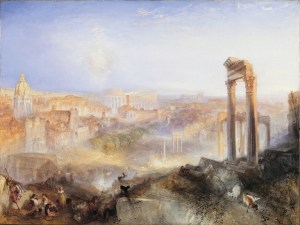 Turner’s painting shows a view of Rome from the Capitoline Hill, as if looking from high in the air down upon the Campo Vaccino in the center of Old Rome, revealing the noble ruins surrounding the ancient forum and a number of still-active Baroque churches . In the foreground, the scene is temporarily occupied by a group of contemporary women, their children and goats and a gathering of monks in front of the church of Santi Luca e Martina.