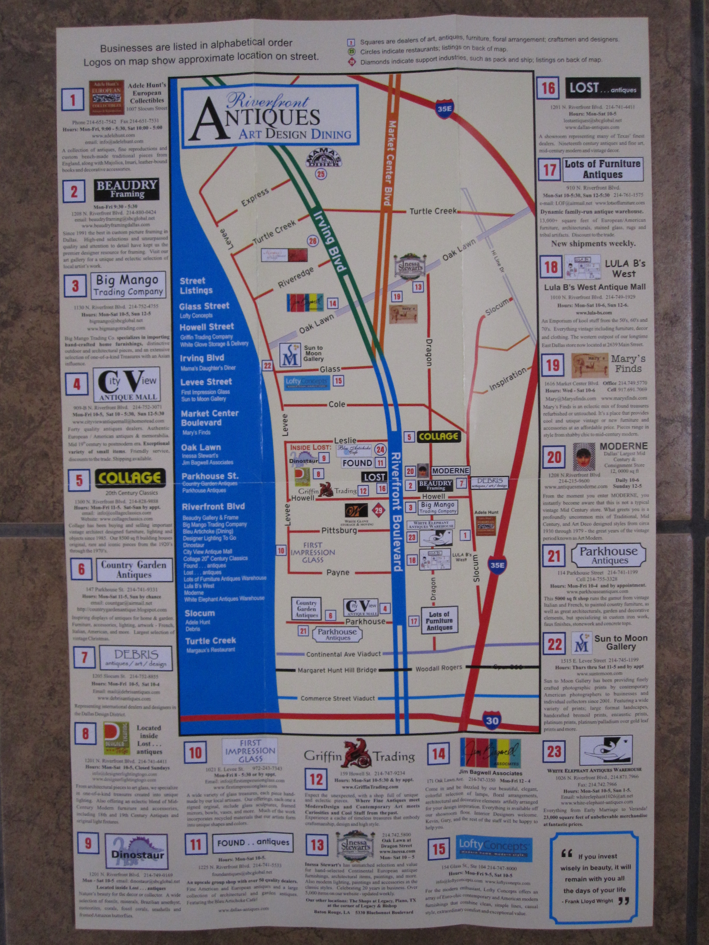 Dallas is not for decorators exclusively, but the stregnth of the decorator community is apparent here, and with that comes an ubundance of attractive booths. We stopped in Lost Antiques, Found Antiques, LuLu B’s, the White Elephant and City View Antique Mall on Saturday. I thought it would be nice to share some photos as well as the Riverfront Antiques Art Design Dining map and Guide.