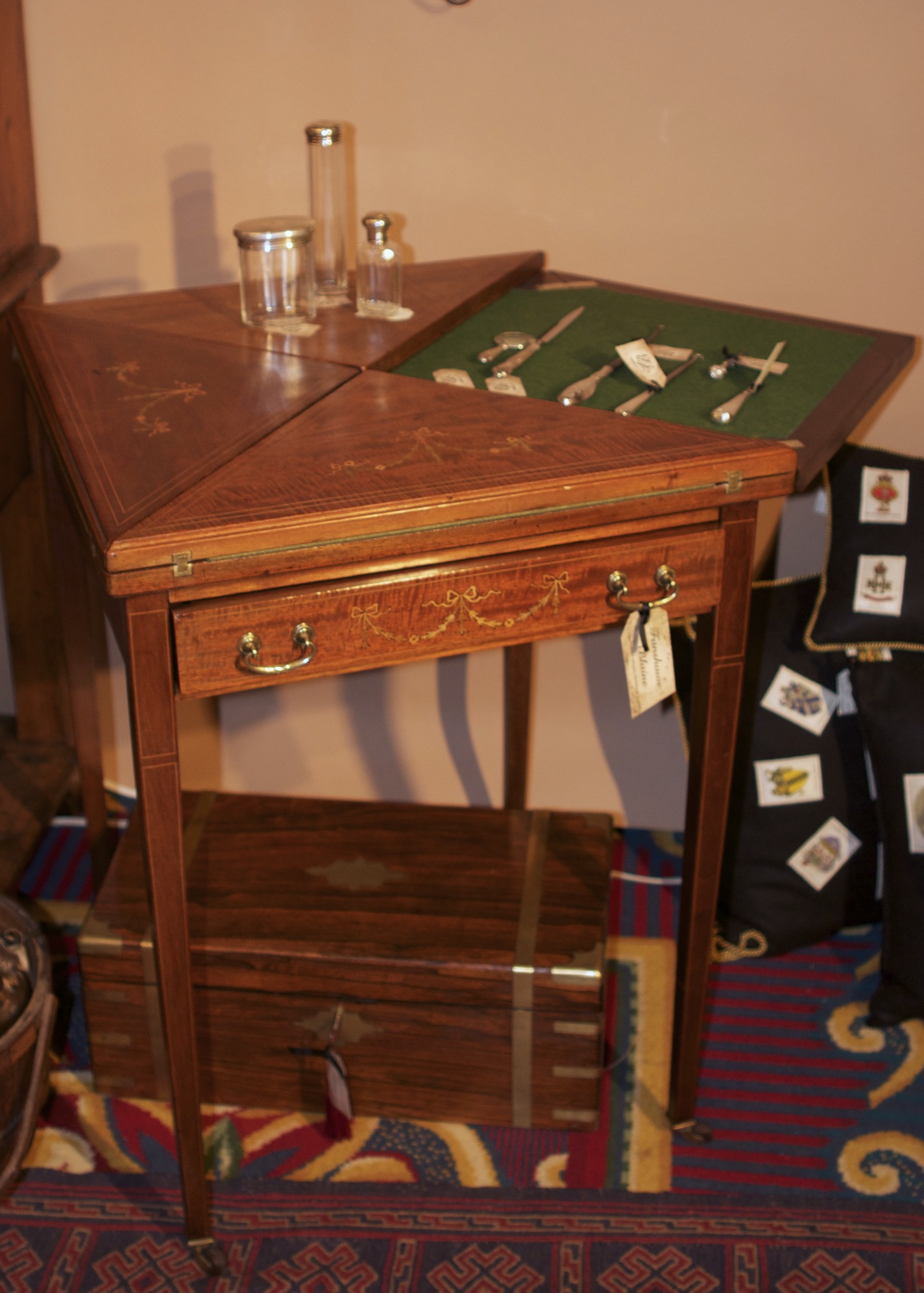 In a similar fashion, Chris Doscher, owner of Witt’s End Antiques, told tantalizing tales of teatime. He was happy to show off his beautiful collection of 18th and 19th-century tea caddies. How easy it was to imagine the “oh so important and fashionable” art of having tea. The detail of the inlay work is intricately pieced together not only on the outside but also on the inside (some with their original foiling). In my mind, I smelled scones, jam, and cream. Suddenly my fancy high-tech coffeepot at home appeared crude in comparison.