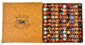 Dan Morphy had predicted there would be strong competition for the Akro Agate No. 1 boxed set containing 100 tri-color corkscrew marbles, and he was right. A colorful and complete selection containing marbles with as many as five colors in their combinations, it had been expected to fetch $4,000-$6,000, but demand for the rare set boosted it $7,000, or $70 per marble.