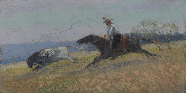 The painting with a center figure also won Geo’s attention. “Round-up” lightens up the lifestyle at the frontier. Geo commented finally there was some activity! Instead of cows being interspersed like wildflowers against the vanishing horizon, the dashing of the cow takes the pounding and huff into the otherwise endless quietitude. Reaugh was famous for using photographs as studies for his paintings. Is this small sketch based on Griffith’s own photograph captured on a road trip?