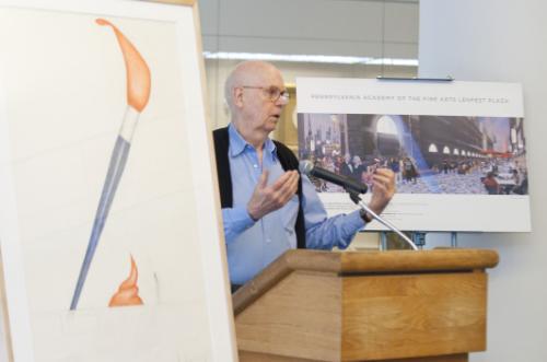 Claes Oldenburg has been commissioned to design a sculpture to be placed in a new pedestrian plaza near the Pennsylvania Academy of Fine Arts (PAFA). Claes Oldenburg is a Swedish sculptor, best known for his public art installations typically featuring very large replicas of everyday objects. Claes Oldenburg’s first large-scale public sculpture was the 45-foot-high Clothespin created for Philadelphia in 1976. Since then, working with his partner and wife, the late Coosje van Bruggen, he has placed 45 Large-Scale Projects in the USA, Europe, Japan, and Korea, including another Philadelphia project, the Split Button (1981), on the campus of the University of Pennsylvania. Another well-known construction is the Free Stamp in downtown Cleveland, Ohio. The Philadelphia Sculpture will consist of a 53-foot tall paintbrush.