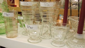 Glass shows have come to the Grapevine Convention Center several times since I’ve come to live in this Dallas suburb. Today I made it into one. I expected a lot of depression glass and found well, a lot of depression glass. I talked with some dealers briefly about what was selling. One answer was Pyrex from the 50s and 60s-the kitchen stuff. Also, mid-century forms are doing well. Any glass I personally have is much older than what I found at this show where items range primarily from the 1920s through the 1950s. It’s also different from an antiques show in that most of the dealers here deal with the same type of items. It’s the rare cases where the pattern is broken–like the dealer with vintage glass lighting fixtures–that made it interesting for me. I was also told there was usually a dealer from Florida who carries early pattern glass who didn’t make it to this show. The world of glass would seem to be able to stretch beyond the items you see here–into bottles, telegraph insulators, and more flint glass.
