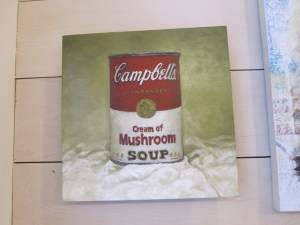 Eric’s favorite is Daniel Birdsong’s Cream of Mushroom on the opposite side of the wall. Among Daniel’s other works, mostly collaged elements of different media, this small oil painting on board looks whimsically different. Any painter who paints a Campbell soup can could not escape the comparison with Andy Warhol. Here Daniel treated it as a realistic still life, not much different from some other larger-than-real donut paintings in the same show; yet he stripped off surroundings to almost bare. And to further defend his objectivity, he defiantly placed the soup can in the middle and lined the eyes at the can level. For me, the can seems to confront me and ask me the simple question: Will you look at me seriously this time?