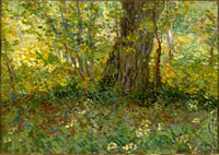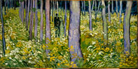 Working initially in the apartment he shared with Theo in Montmartre, van Gogh painted a series of still lifes of flowers and fruit such as Still Life with Pears (1888, Gemäldegalerie Neue Meister, Dresden) and Sunflowers (1887, Metropolitan Museum of Art). In these works, objects are often seen from above yet are placed very close to the picture plane in a tightly cropped space which provides no clues to their context or setting. Pieces of fruit appear to tip forward and threaten to roll out of the picture. Van Gogh’s landscapes such as Undergrowth (1887, Centraal Museum, Utrecht) stress the abundance of grasses and flowers by cropping out the horizon.