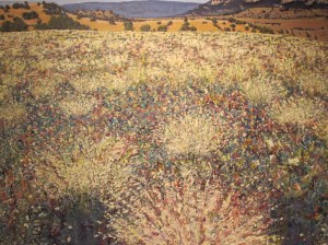 Woodson currently teaches art at TCU, his Alma mater. He told the full room he had been drawn to the landscape since childhood, mostly because he wanted to be a cowboy and that’s where the cowboys were. He saw the landscape on many trips driving across Arizona and New Mexico on the way to California. Woodson grew up in Waco, Texas, and says he never saw art until his college days.
