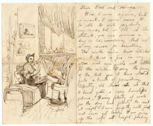 The other letter, written from Paris, includes a self-portrait illustration of the artist with a pompadour-style hair-do, sitting in his flat. Another drawing he titles “my foot in sandals.” The content gives accounts of Mr. Benton’s work and daily life. He talks about landscape painting, the cost of materials, a baker who extends him credit, his art dealer, a hired model and more.