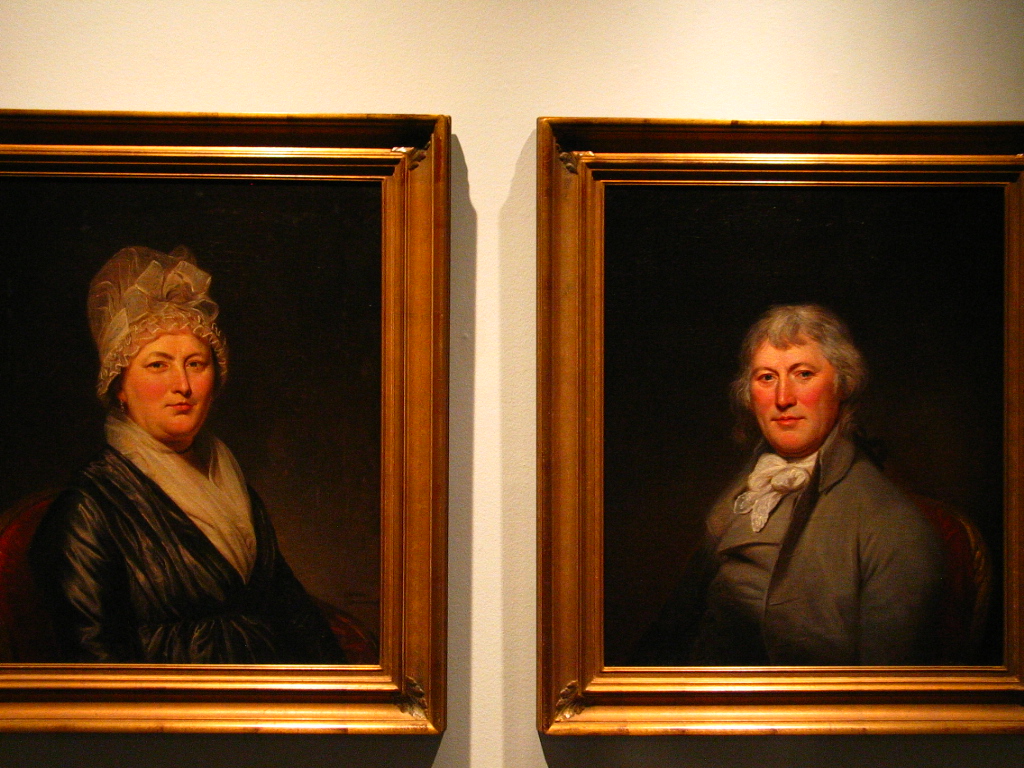 Charles Willson Peale’s half-length portraits of the De Peysters demonstrate the artist’s supreme power in easing the unflattering truth with a sympathetic touch of humanity. Both radiate charms and amicability that are more often associated with Ralph Earl. The couple, seated and illuminated by the light above, emerge from the dark with a convincing roundness. Ann De Peyster is particularly interesting. Moles, bumps, and wrinkles are depicted with relentless accuracy and hence drawing viewers into her eyes. If the smiles from her slightly lifted mouth corners are not exactly discernable, her rosy complexion and relaxed gesture speak of contention and confidence of the bourgeois class of a young nation.