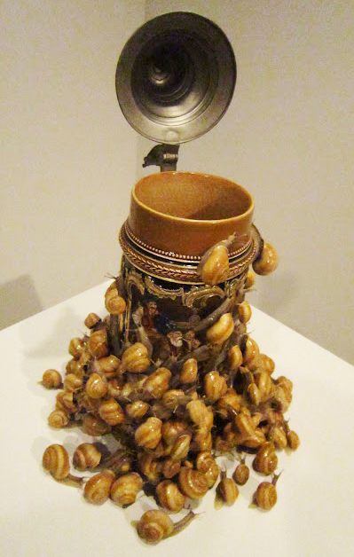 Indeed a look at the work shows incredible patience and attention to detail. Everything in this work appears as if it might be a “found object,” yet nothing is. Each snail has been created, as well as the beer stein. The base is included as part of the artwork, and a look into the annals of the drinking glass shows a bottomless pit.
