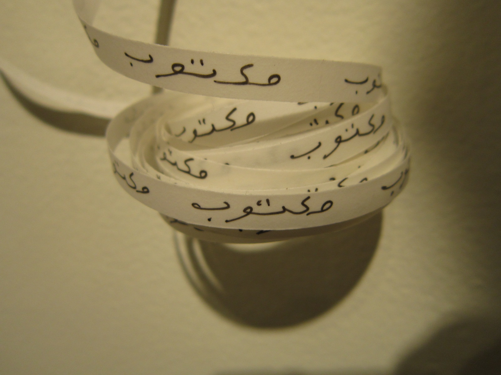 At Conduit Gallery, Measure by Annabel Daou includes dozens of text-based drawings on mending tape. The language, both in English and Arabic, is based on the Wheel of Fortune, which anchors our life into four directions: I shall reign, I reign, I have reigned, I am without a kingdom.