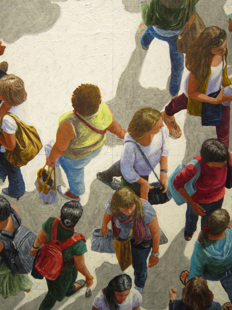 Zwadlo says in his artist statement that he paints people represented realistically in an abstract urban space and that the aerial point of view is the point of the painting. The inspiration came from his time living in Manhattan, where the observed street activity is more constant, and the arrangements endless.