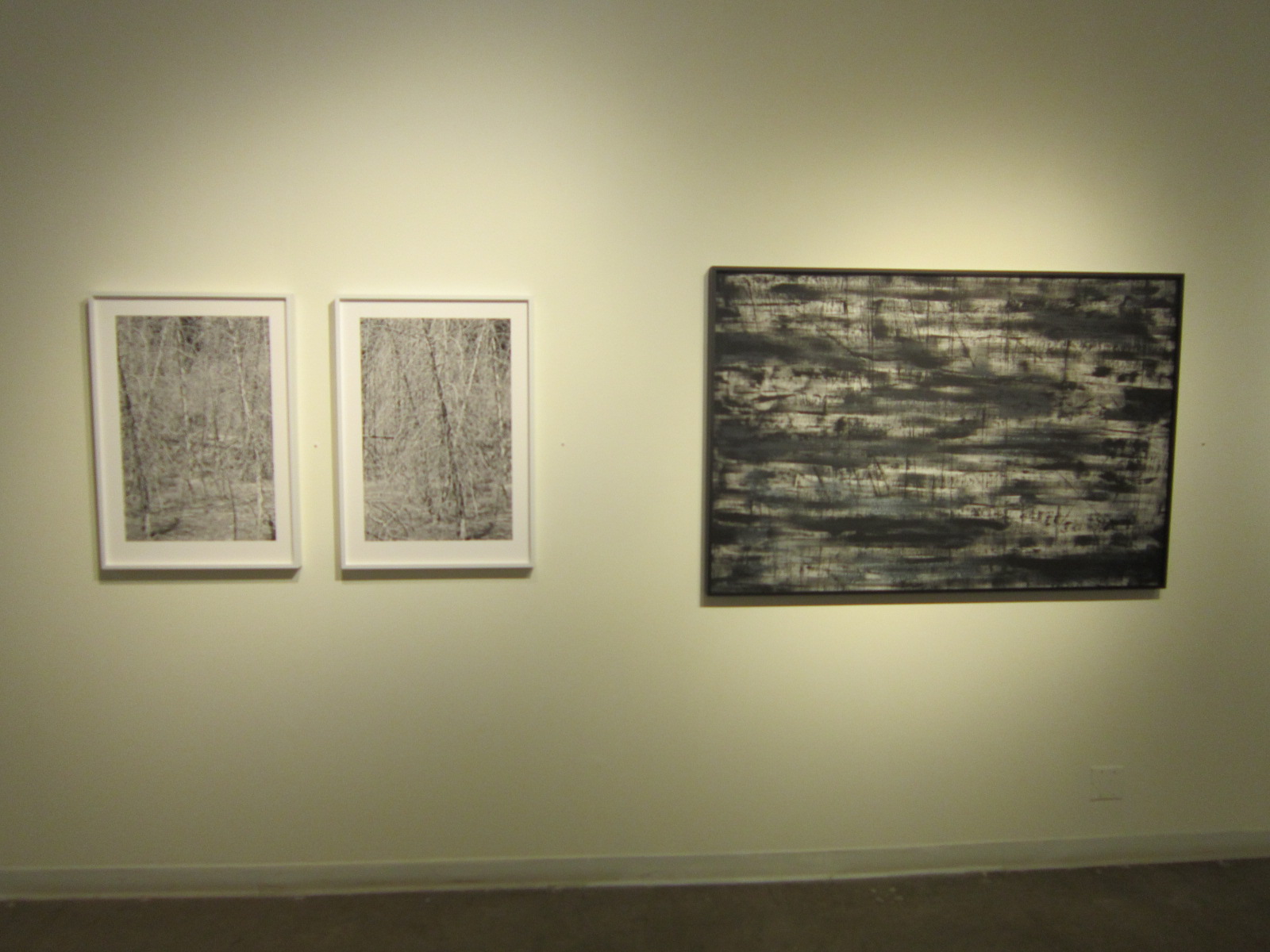 Also at Conduit, Reinhard Ziegler’s installation of photos and paintings is a visual statement that both representation and abstraction stem from nature. While such a statement is not new, it is rare to see that the two styles actually merge into one. Myriad winter branches, when overexposed in black and white photos, look almost like the negation of his brushstroke paintings. In those succinct paintings, he leaves dry ink on a gessoed surface through hard bristle brush strokes.  We call it chaotic when seeing the patterns of leafless trees, and we think it poetic in reading those brushstrokes, but what we really meant is to recognize that an idealized landscape could look as chaotic as an abstract painting, and abstract brushstrokes dance just as elegantly as nature itself. In a show of black and white, Ziegler unites representational and abstract in one rhapsodic rhythm.