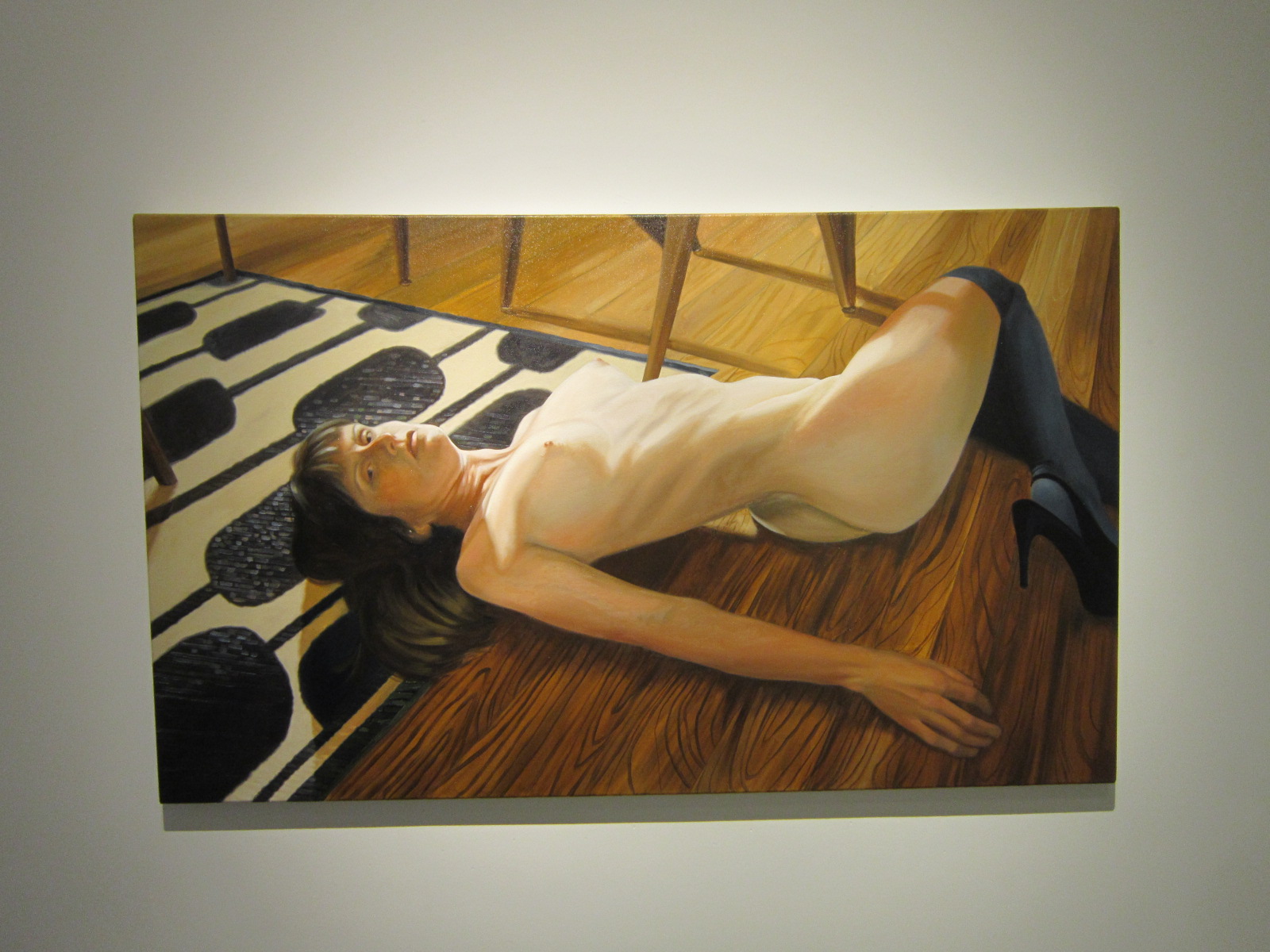 Fugue State, a self-portrait with the setting and pose based on an old porn photo, features a high angle and suspended tension.  The perspective reminds me of Philip Pearlstein, except Vance is much warmer and relents in rendering bodies. Of course, Pearlstein’s models always look like models, while here the viewers are left to confront directly with a mysterious seductive look.