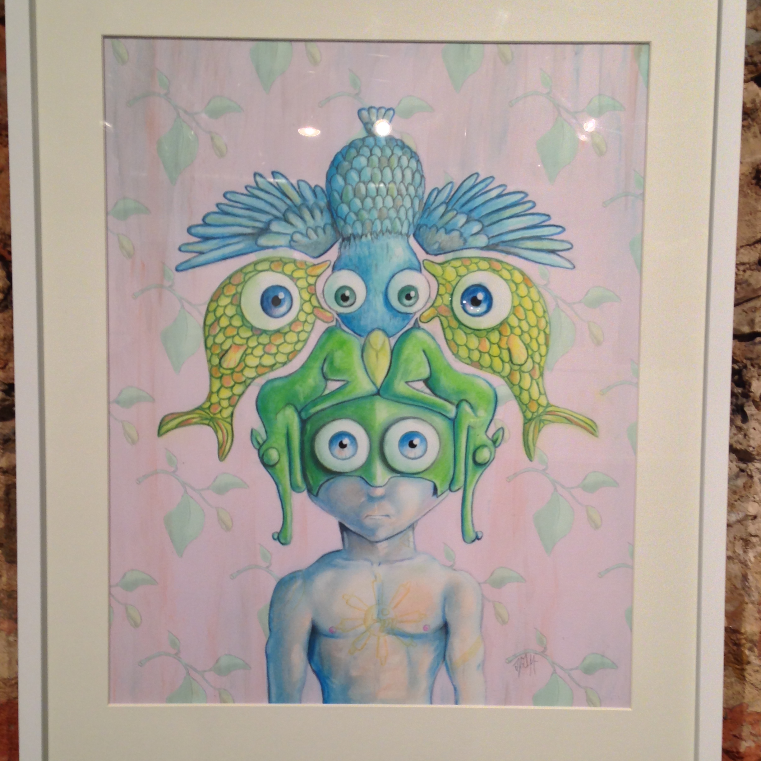 The center piece, Bird Ass Bird, is a piece of blown glass sculpture installation. (Dallas glass artist Aaron Tate collaborated with TJ on this unique piece.) It instantly transforms the gallery into a wonderland where fantasy dominates reasoning. Besides a few pieces with an unabashed sexuality, most faces, despite imaginative masks, totems and symbols, look restraint. They serve as a mirror to reflect one’s own. After all, the masks and the wilderness create a mental and physical xanadu where everyone can, for a moment, be whatever and whoever he wants to be. We have all been behind the masks, and through those eyes, we fills our own expressions.