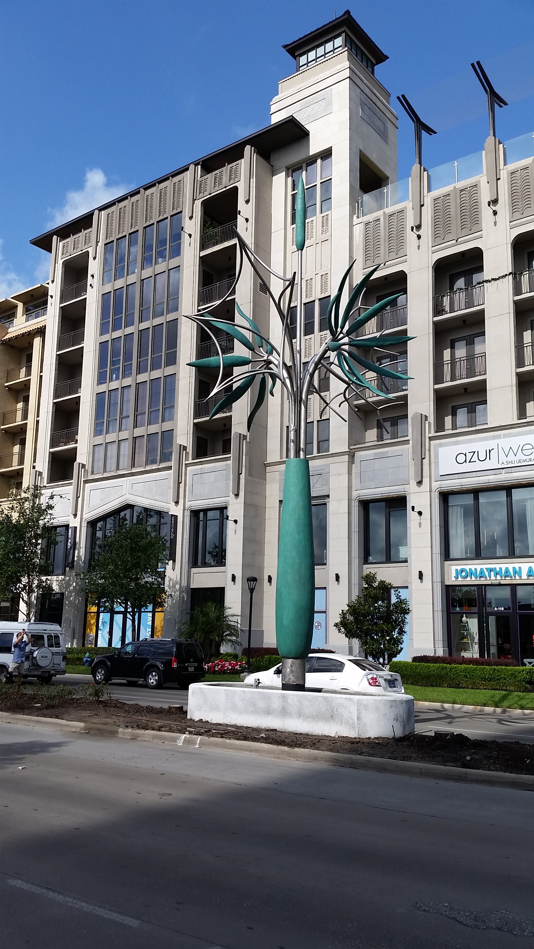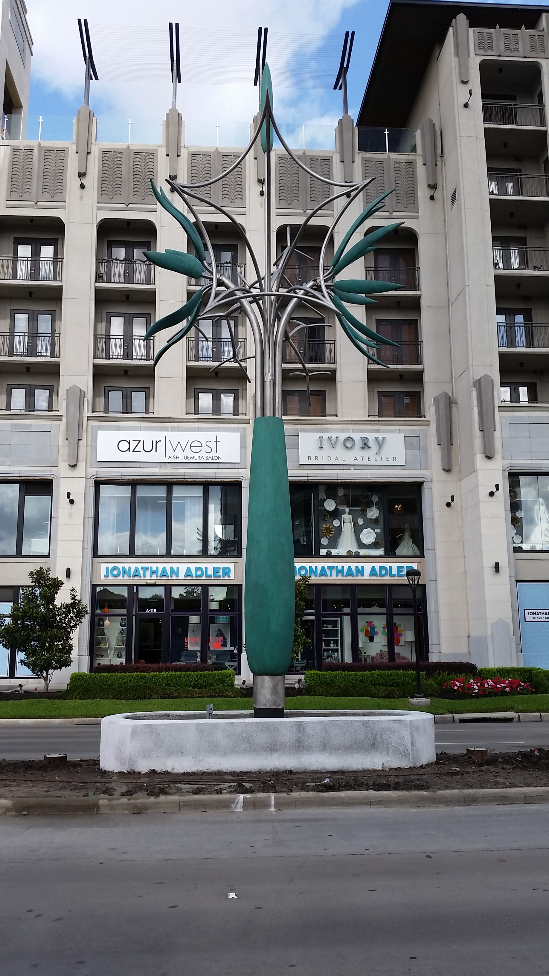 Though it has an urban placement, it’s made to be seen by motorists. Surls set it against a blue sky. For pedestrians the sculpture is most easily seen from the sidewalks, against buildings. One of which is the 2727 Kirby high rise which houses the Jonathan Adler store.