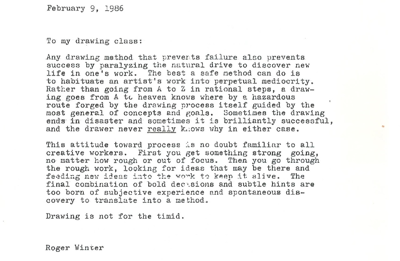 To my drawing class: Any drawing method that prevents failure also prevents success by paralyzing the natural drive to discover new life in one’s work. The best a safe method can do is to habituate an artist’s work into perpetual mediocrity. Rather than going from A to Z in rational steps, a drawing goes from A to heaven knows where by hazardous route forged by the drawing process itself, guided by the most general of concepts and goals. Sometimes a drawing ends in disaster and sometimes it is brilliantly successful, and the drawer never really knows why in either case.