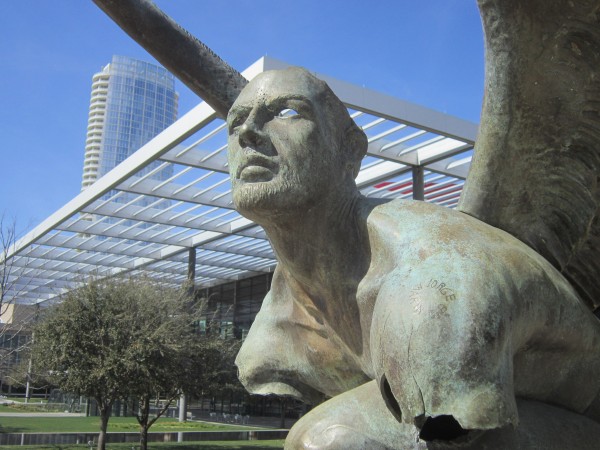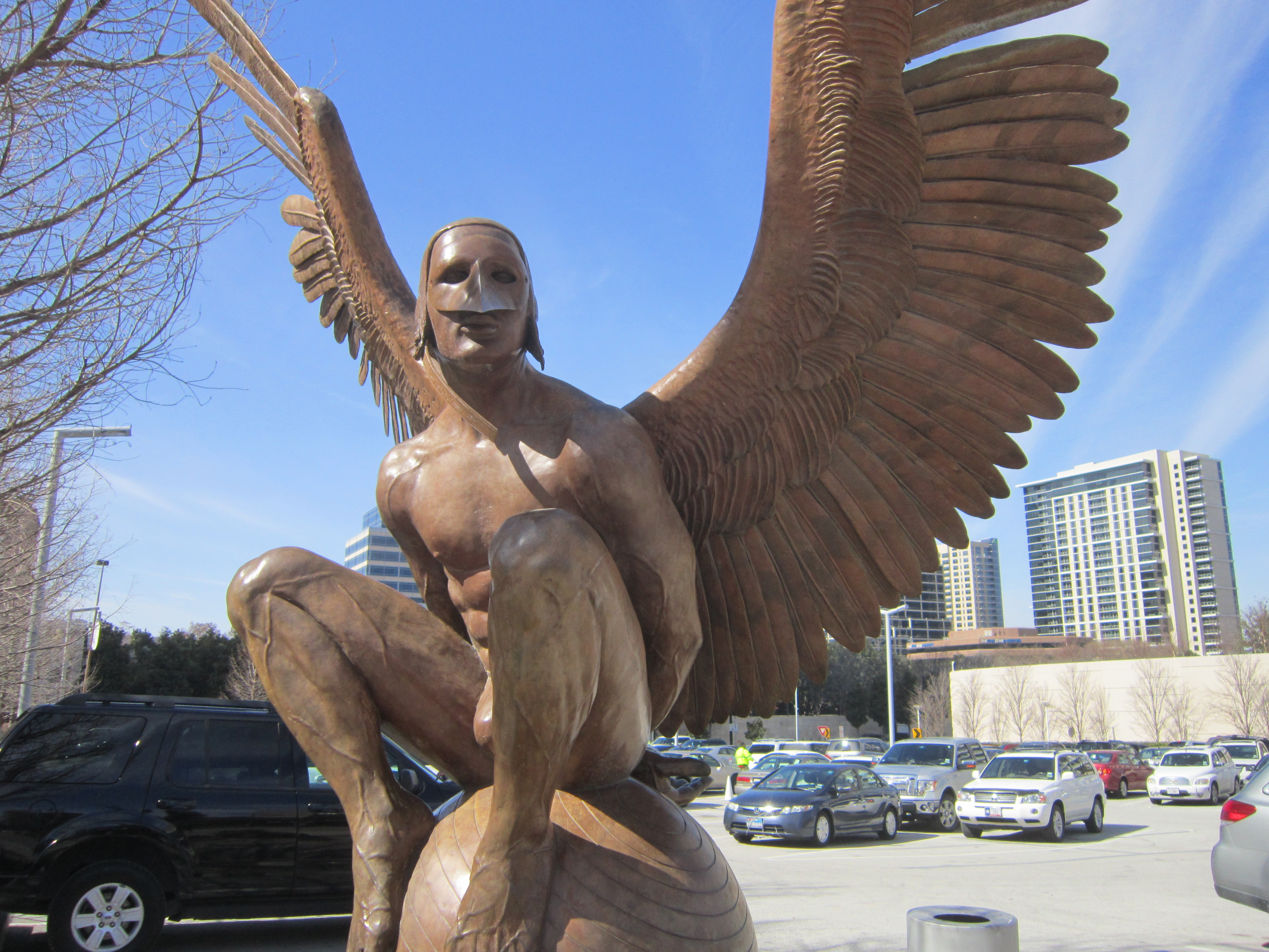 Beautifully crafted, classic but not nostalgic, the sculpture provides something public spaces in Dallas have been missing. In architecture circles, this is sometimes called texture, but this sculpture goes beyond that. Perhaps “texture that talks” is a way to describe it. The winged figures help break up the large cold plazas that are so common here and invite pedestrians to engage with them. It would seem the presence of public sculptures may go so far as to point out the fact that many of these public spaces exist at all.