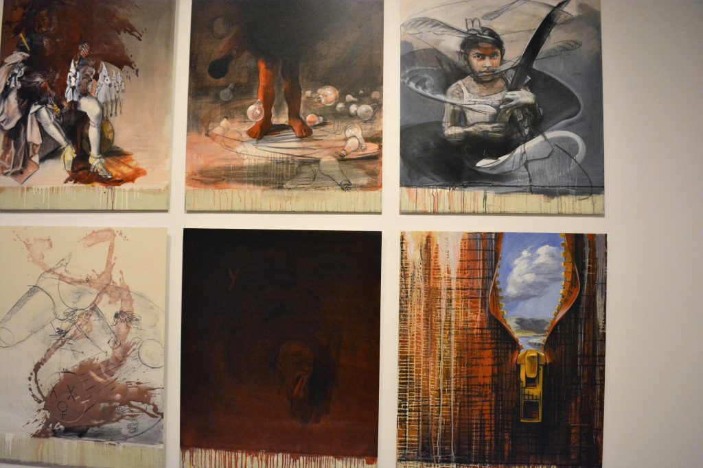 Viewed from afar, these panels carry movement and momentum. Glier applies large gestural strokes in deep-hued colors to infer a world of anger, fear, and violence. Despite all the commotion in each painting, he often positions the little legs of Lili, with extraordinary anatomy, centered and firmly grounded. And here and there, upon closer inspection, we find graffiti. They spell out words as if all were part of mischievous play.
