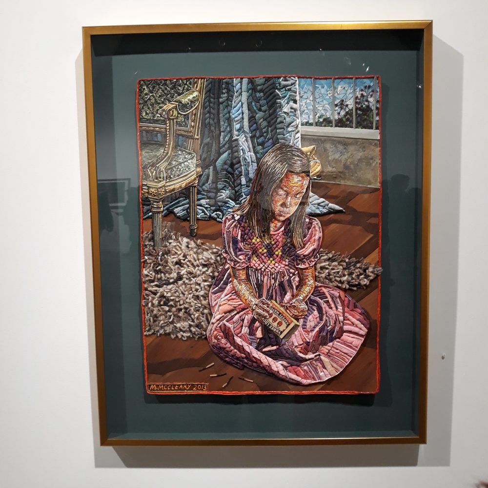 Sometimes in Darkness is the most abstract of the lot. It’s not technically abstract, it just takes a moment for the what of it to come into focus. Likely it is a night view of rain on a windshield with a lit gas station in sight. I’ve seen paintings of raindrop-laden windshields, and this is a popular Instagram subject, but no one puts the pieces together quite like Mary. I can’t imagine finding the objects to create a concrete image, let alone one of this complex verging on the abstract. The title seems to suggest a point in time in both metaphorical and physical darkness. Of course, any point in time has many mental and physical components, and the unconventional materials that make up the image lend themselves perfectly to the subject.