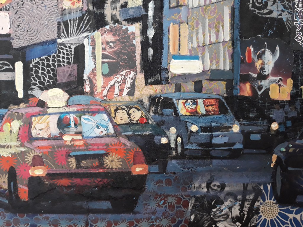 Proulx commonly depicts urban scenes full of consumer messages with less obvious images incorporated alerting us to the exploitation on which our world depends. On the other hand, Macció interrupts the influence of television to suggest a sinister presence.