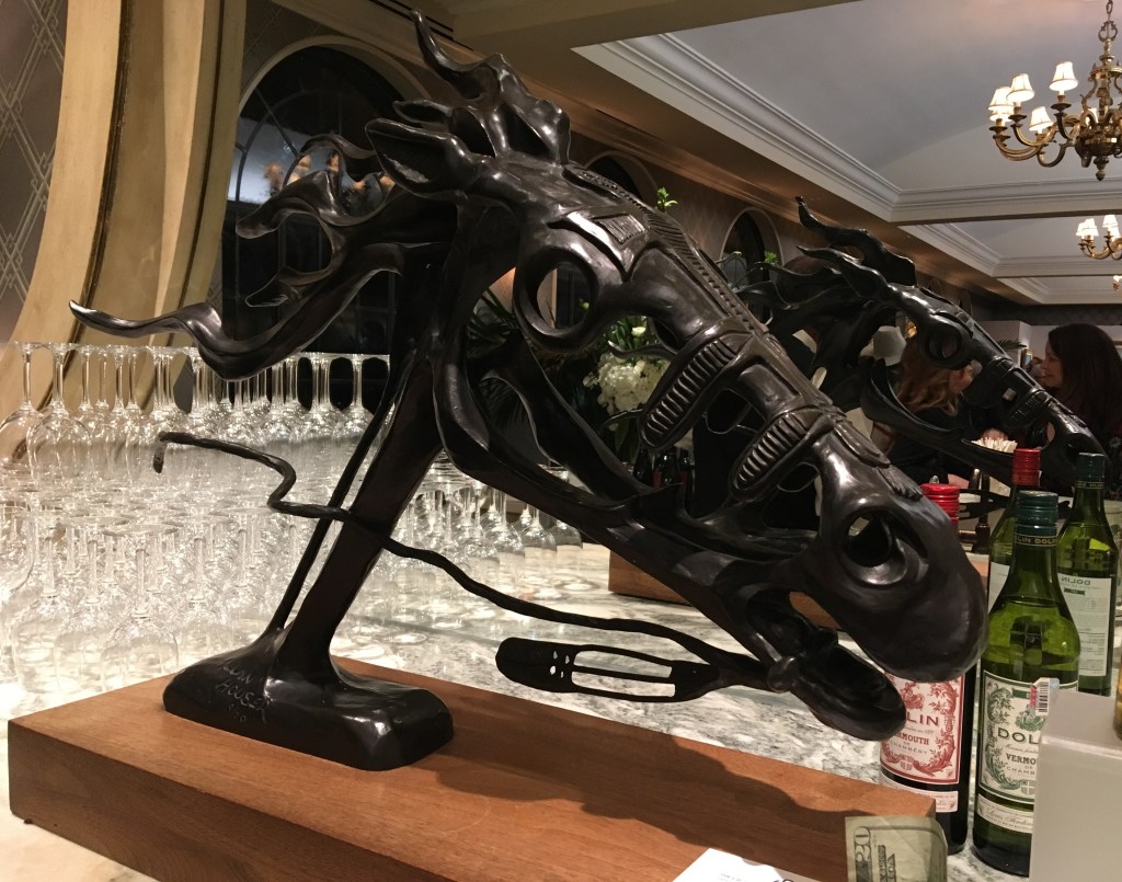 Before we left the show, we noticed a sculpture piece behind the wine bar. Allan Houser’s “War Pony” is a horsehead with a harness. Cast in bronze as a hollow skeleton, the horse head recalls calaca from Mexican culture. Polished with dark brown patina, with ropes flying in the air, its dynamics, fluidity, assertiveness and absurdity make it almost out of place. Interestingly, it is not offered in the current single-owner sale, but will be included in Bonham’s Native American Art sale in June 2019.