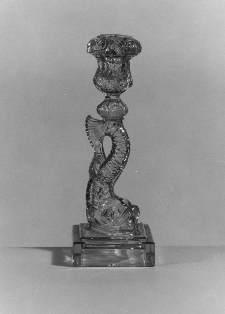 One of the forms that stands out is the pressed glass “dolphin” candlestick. You might know these as pressed glass or sandwich glass, but that’s not because two pieces of molded glass are sandwiched together. The name comes from the Boston & Sandwich Glass Company in Sandwich, Massachusetts.